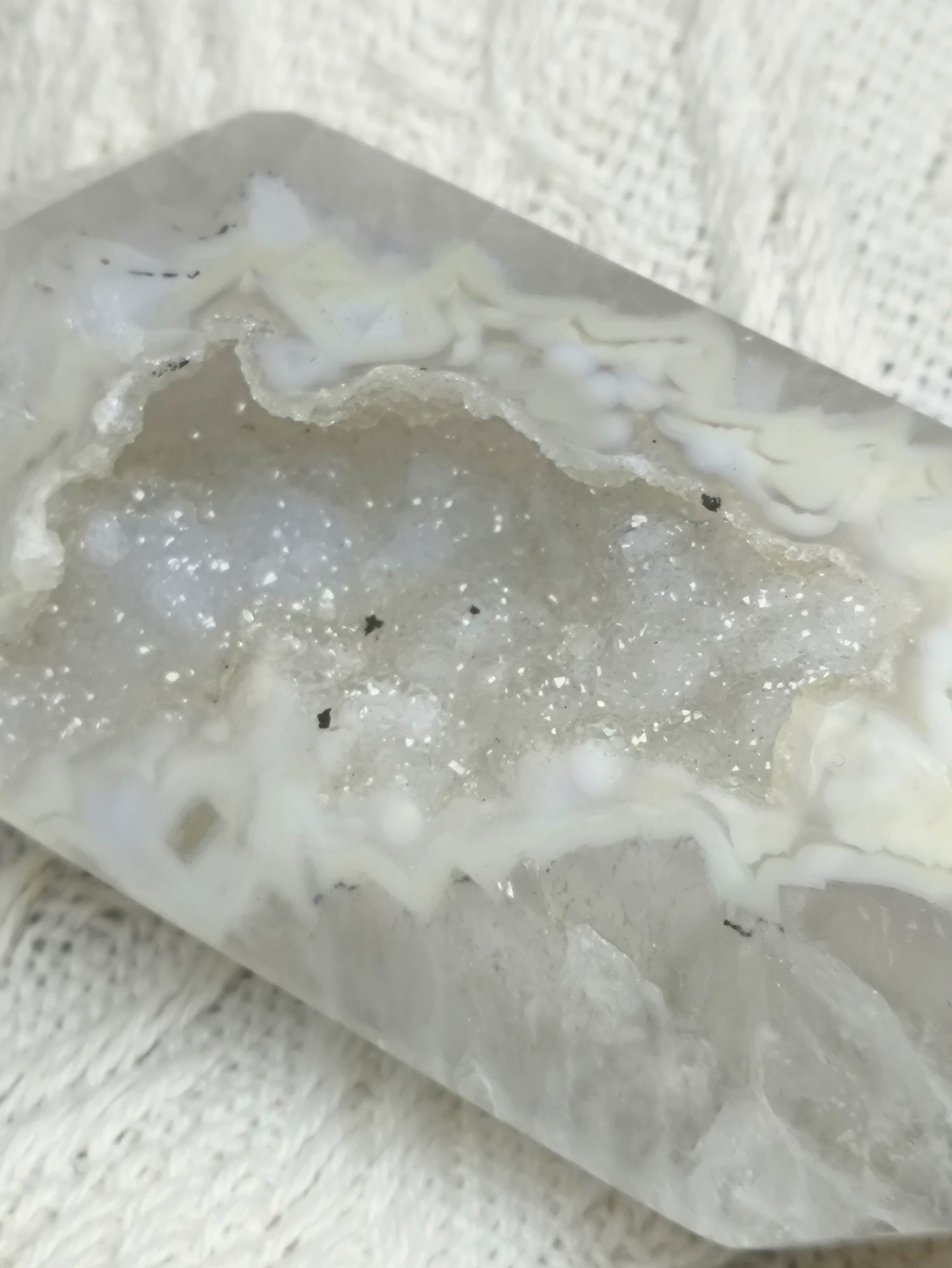Each Druzy White Agate Tower is one-of-a-kind, showcasing delicate sparkle, layered bands, and unique crystal patterns. It blends aesthetic beauty with grounding, purifying energy.