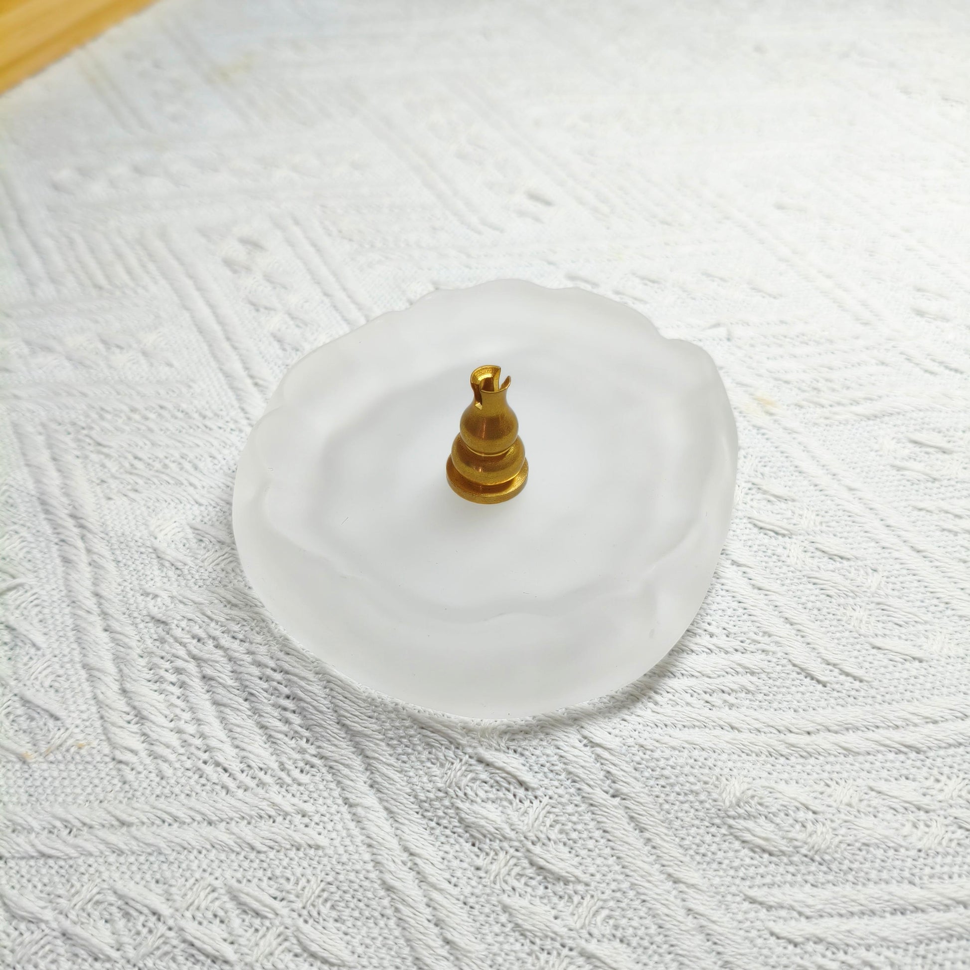 Transform your space into a sanctuary of peace with this golden incense burner holder paired with a frosted glass plate.