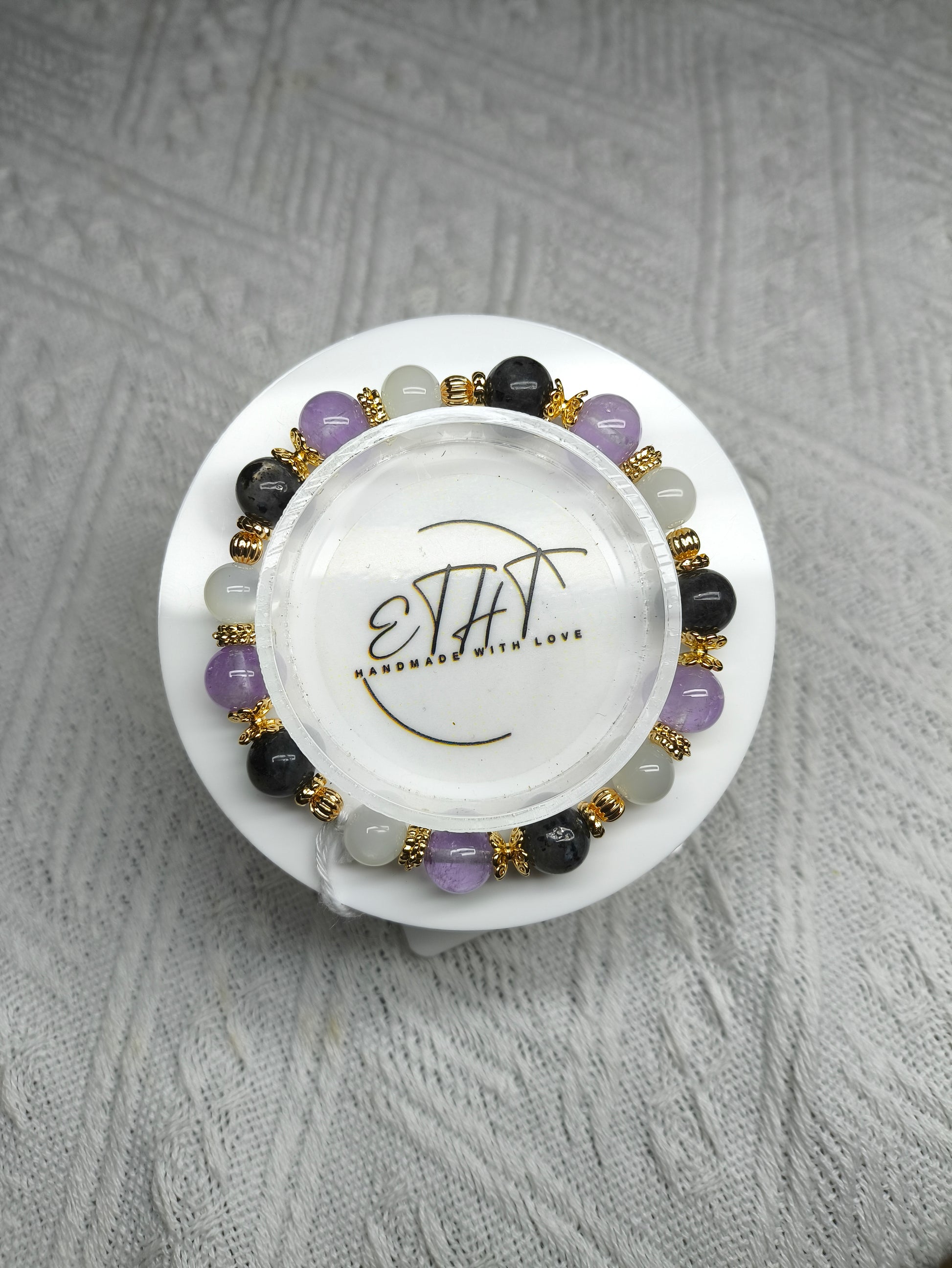 A magical blend of crystals that connects you with intuition, inner wisdom, and higher guidance. Handcrafted with Moonstone, Labradorite, and Amethyst, this bracelet supports emotional balance, spiritual awakening, and psychic protection — a must-have for anyone on a self-discovery journey.